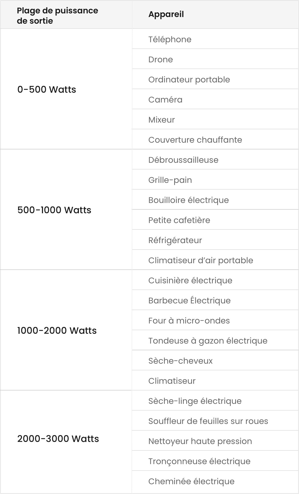 Remarque : Ces plages de puissance sont typiques des appareils courants, mais la consommation réelle peut varier en fonction du modèle spécifique et de son utilisation.