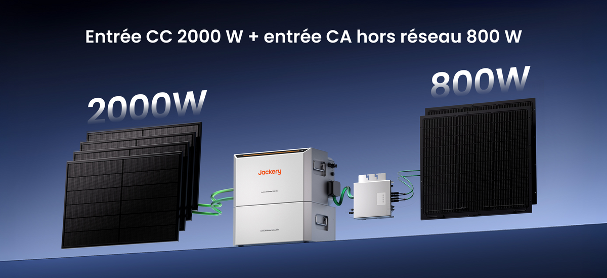 Le HomePower 2000 Ultra prend en charge jusqu’à 800 W via micro-onduleur et 2000 W via double MPPT solaire (permettant de connecter jusqu’à 4 panneaux solaires de 500 W chacun). En combinant ces deux modes d’entrée, le système peut atteindre une puissance totale d’entrée allant jusqu’à 2800 W.