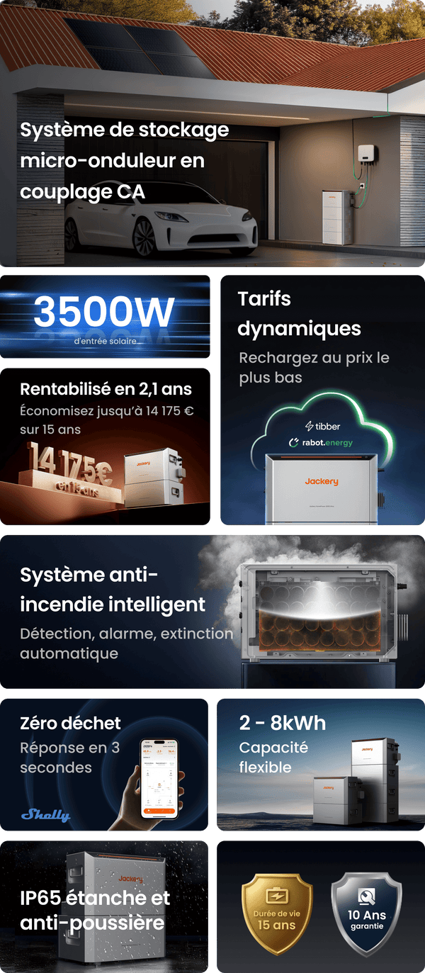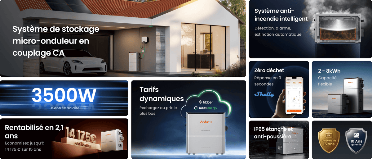 2. Les économies annuelles de 945 € sont calculées sur la base de la configuration suivante : Jackery HomePower 2000 Ultra, trois batteries d’extension de 2 kWh chacune, production solaire de 3 500 W, compteur intelligent et quatre supports, avec un coût de l’électricité à 0,25 €/kWh. Ce montant est donné à titre indicatif ; les économies réelles peuvent varier selon l’utilisation et les conditions environnementales.