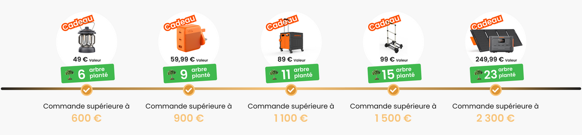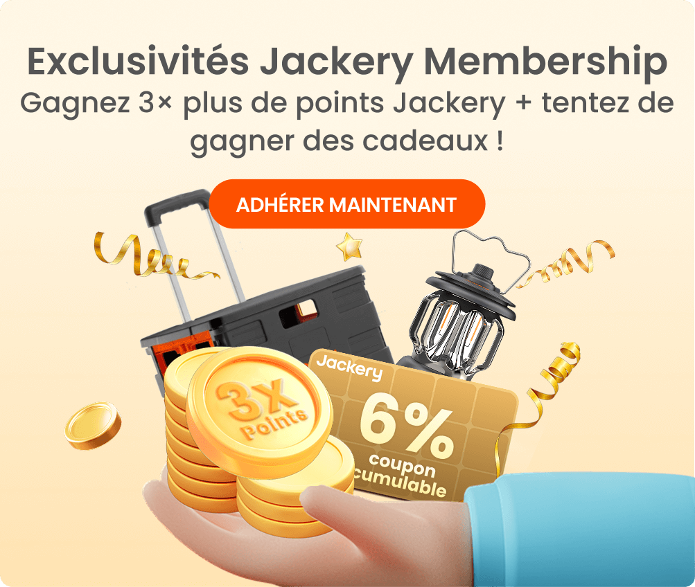 2. Les économies annuelles de 756 € sont calculées sur la base de la configuration suivante : Jackery HomePower 2000 Ultra, trois batteries d’extension de 2 kWh chacune, production solaire de 2 800 W, compteur intelligent et quatre supports, avec un coût de l’électricité à 0,25 €/kWh. Ce montant est donné à titre indicatif ; les économies réelles peuvent varier selon l’utilisation et les conditions environnementales.