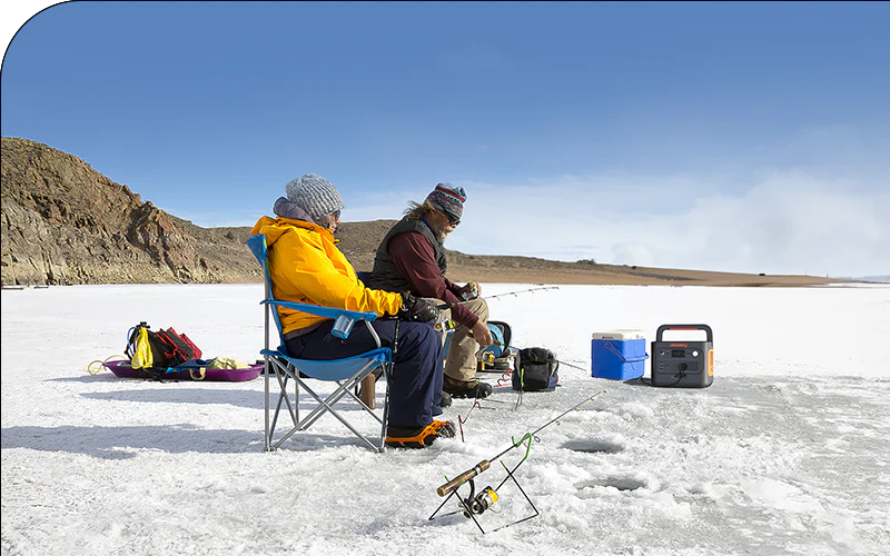Lors de la pêche sur glace, le froid, le vent et l’obscurité représentent de vrais défis. La station d’énergie portable Jackery Explorer 2000 v2 fonctionne de manière fiable à des températures allant de -10 °C à 45 °C et fournit assez d’énergie pour les chauffages, l’éclairage et les perceuses à glace.