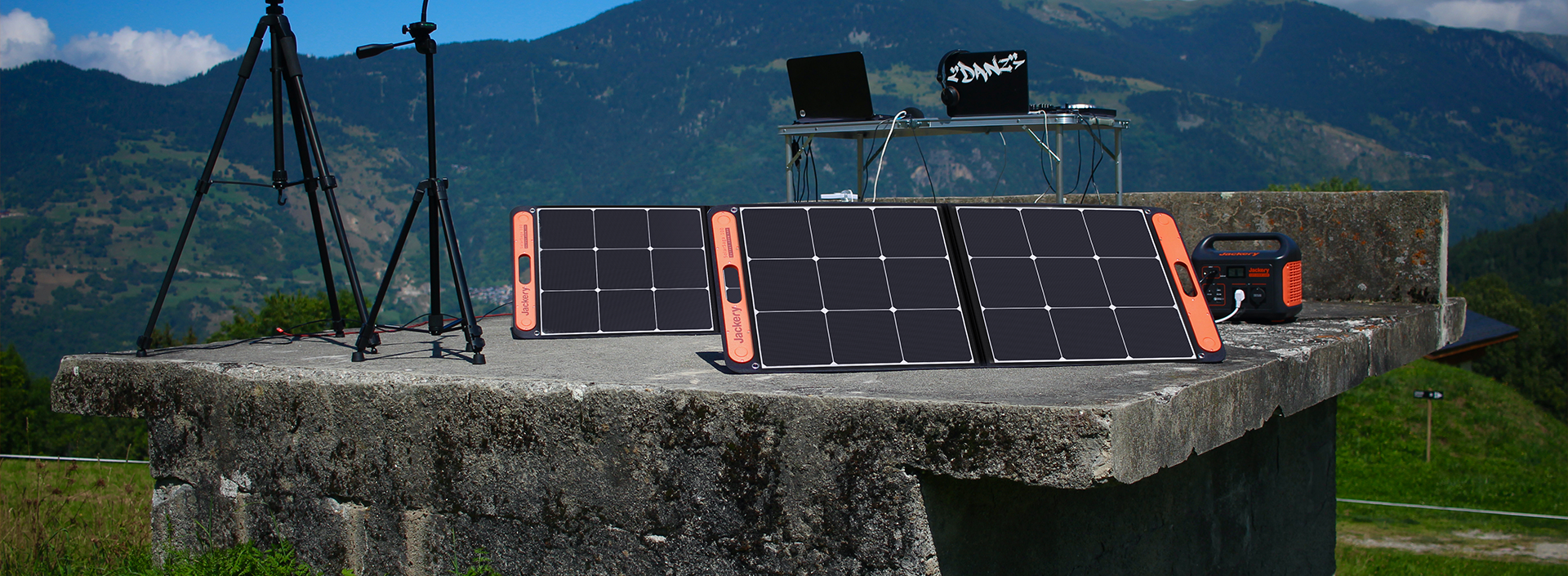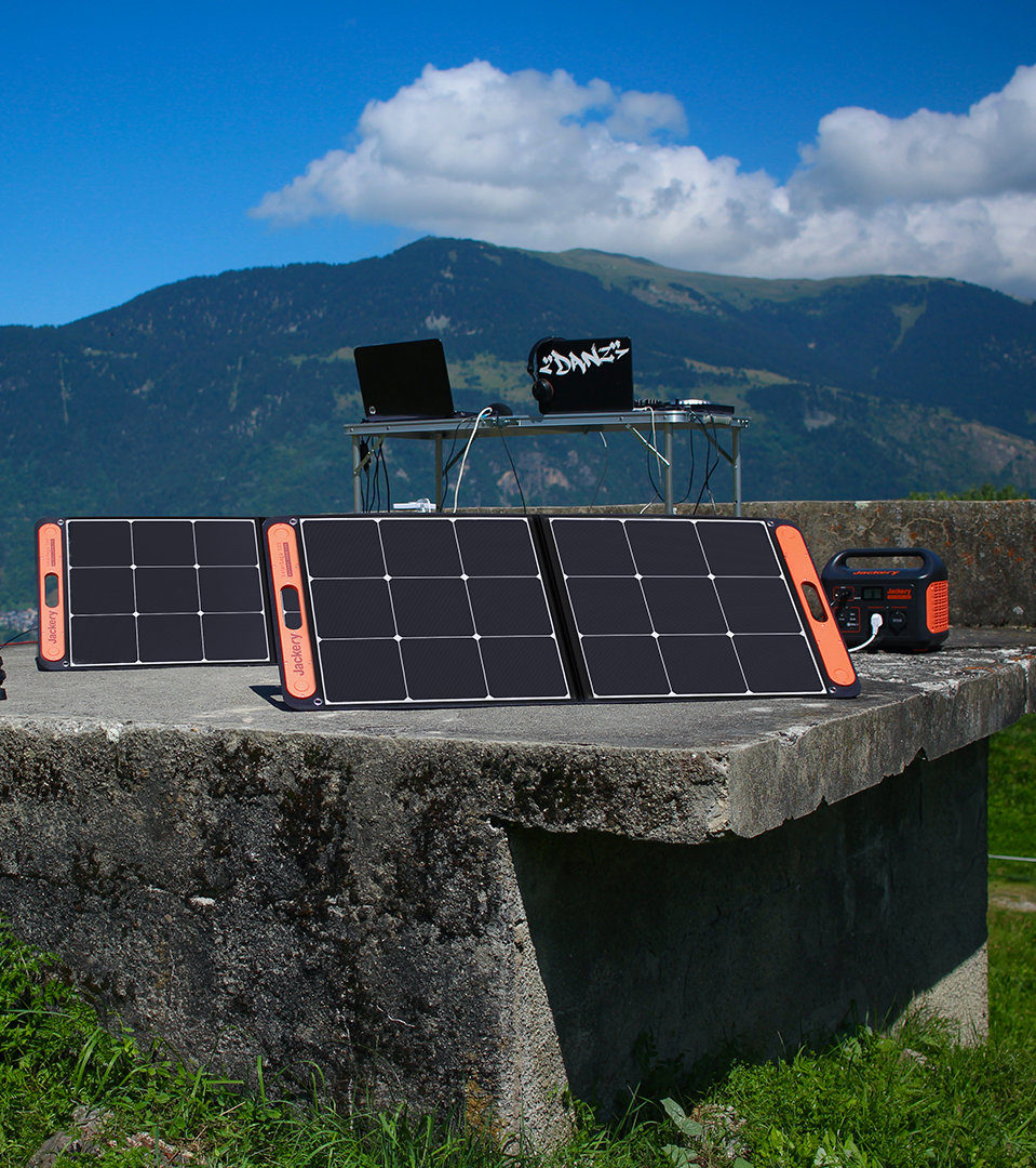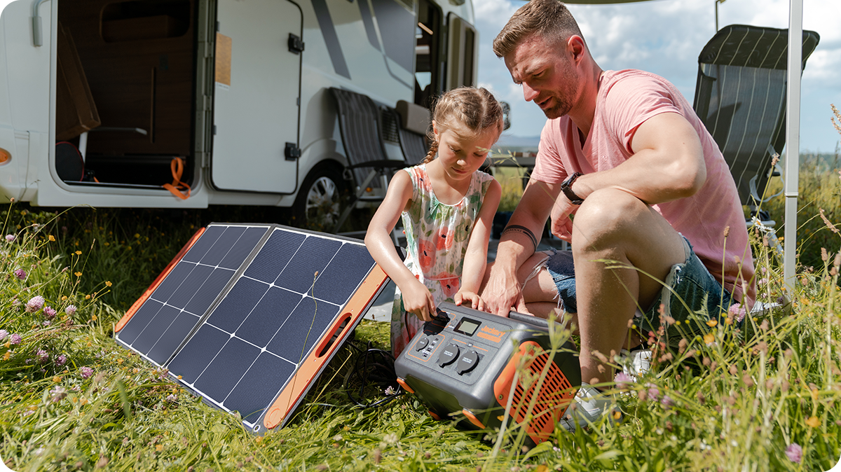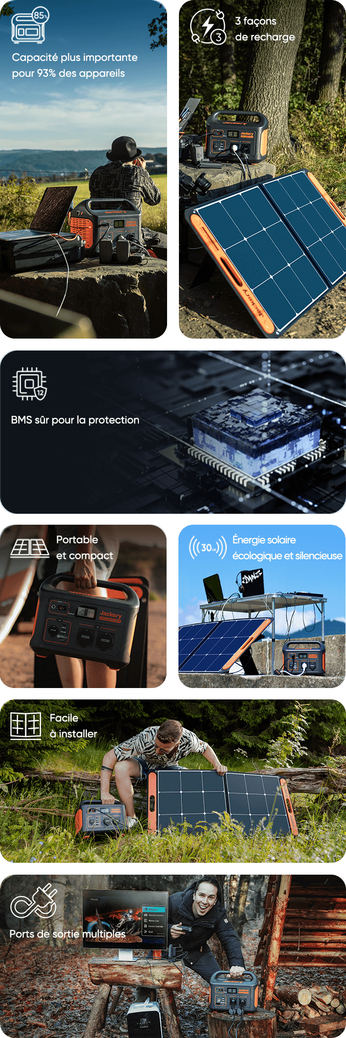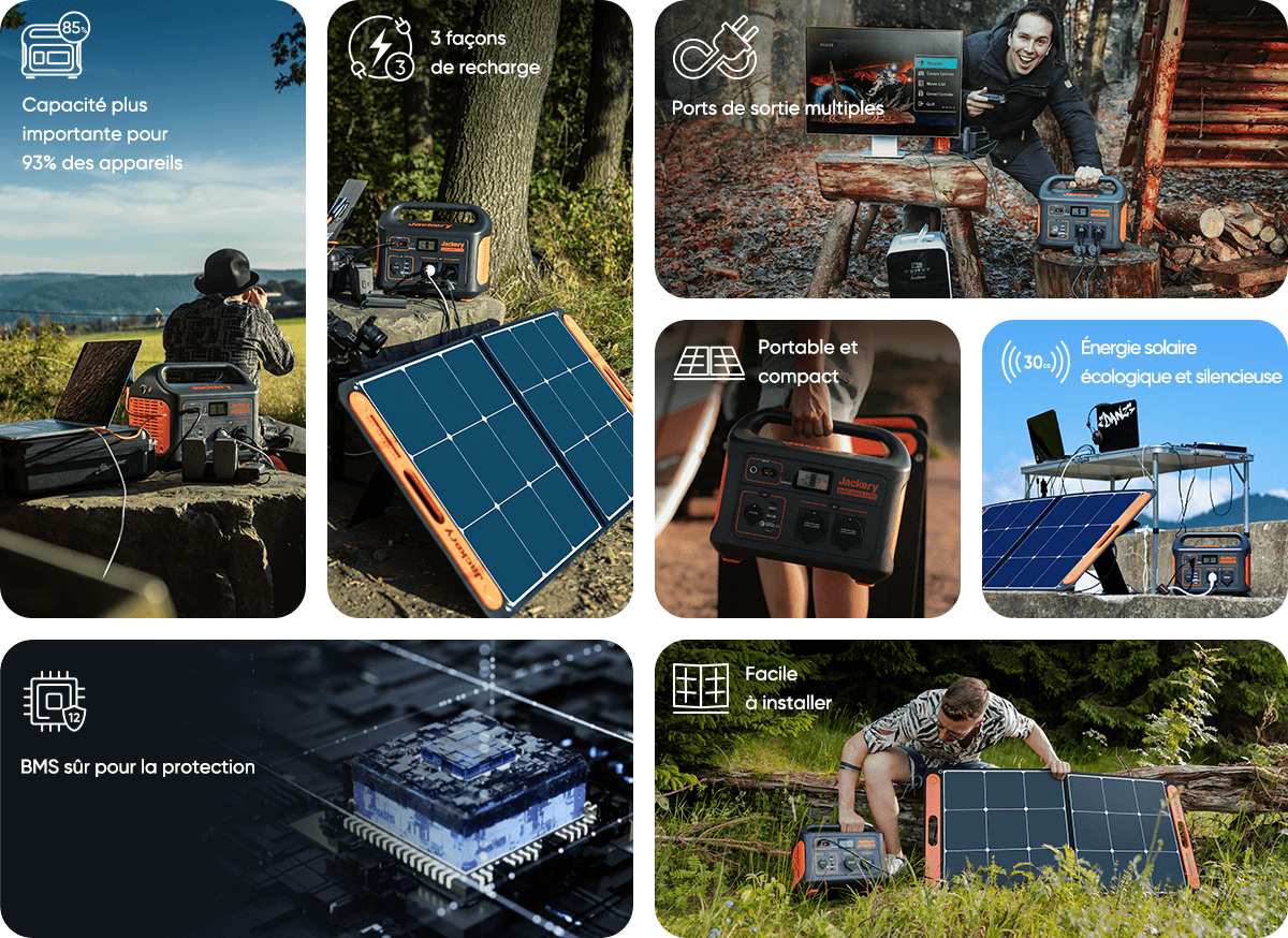Jackery Générateur solaire 1000 constitue une solution solaire qui combine la station électrique portable Explorer 1000 avec des panneaux solaires SolarSaga 100W. Il transforme l'énergie solaire captée par les panneaux solaires en énergie électrique, avant de l'entreposer dans la station d'alimentation portable pour une utilisation ultérieure. Avec ce générateur solaire, vous disposez d'une source d'énergie fiable et écologique pour les campeurs, les camping-cars ou comme solution de secours en cas de panne d'électricité.