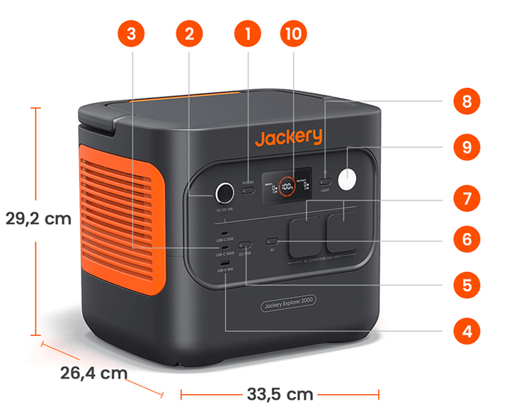 La Station énergique portable Jackery Explorer 2000 v2 offre une capacité impressionnante de 2042Wh et une puissance de 2200W, capable d'alimenter plupart de vos appareils ménagers. Il dispose également de 2 prises secteur, de ports USB-A 18W et USB-C 100W + 30W, ce qui vous permet de charger simultanément plusieurs appareils tels que des téléphones et des ordinateurs portables.