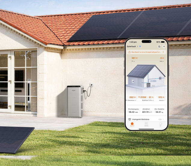 *1 104€ par an : Calcul basé sur un SolarVault 3 Pro Max AC avec cinq batteries additionnelles de 2,52 kWh et un prix de l’électricité de 0,20 €/kWh. Les économies réelles peuvent varier en fonction de la configuration et de l’utilisation du système.